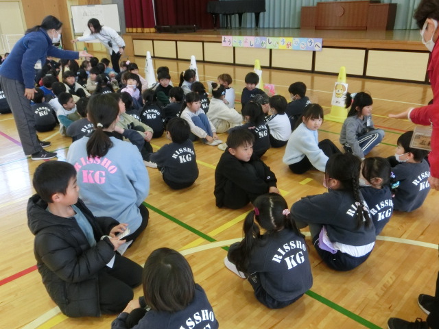 2月16日(月)、立正幼稚園の年長のみなさんと吉岡小学校1年生で交流会を行いました。学校内を探検しながら、所定の教室に行ってスタンプを集めたり、「おちたおちた」「もうじゅうがりにいこうよ」などのゲームで交流を楽しみました。